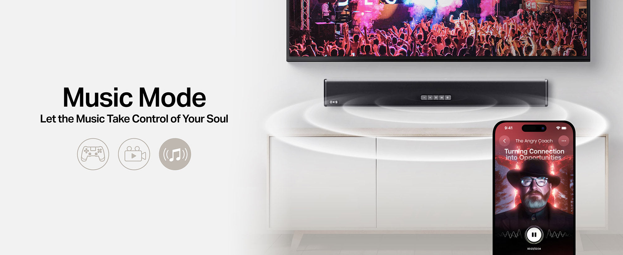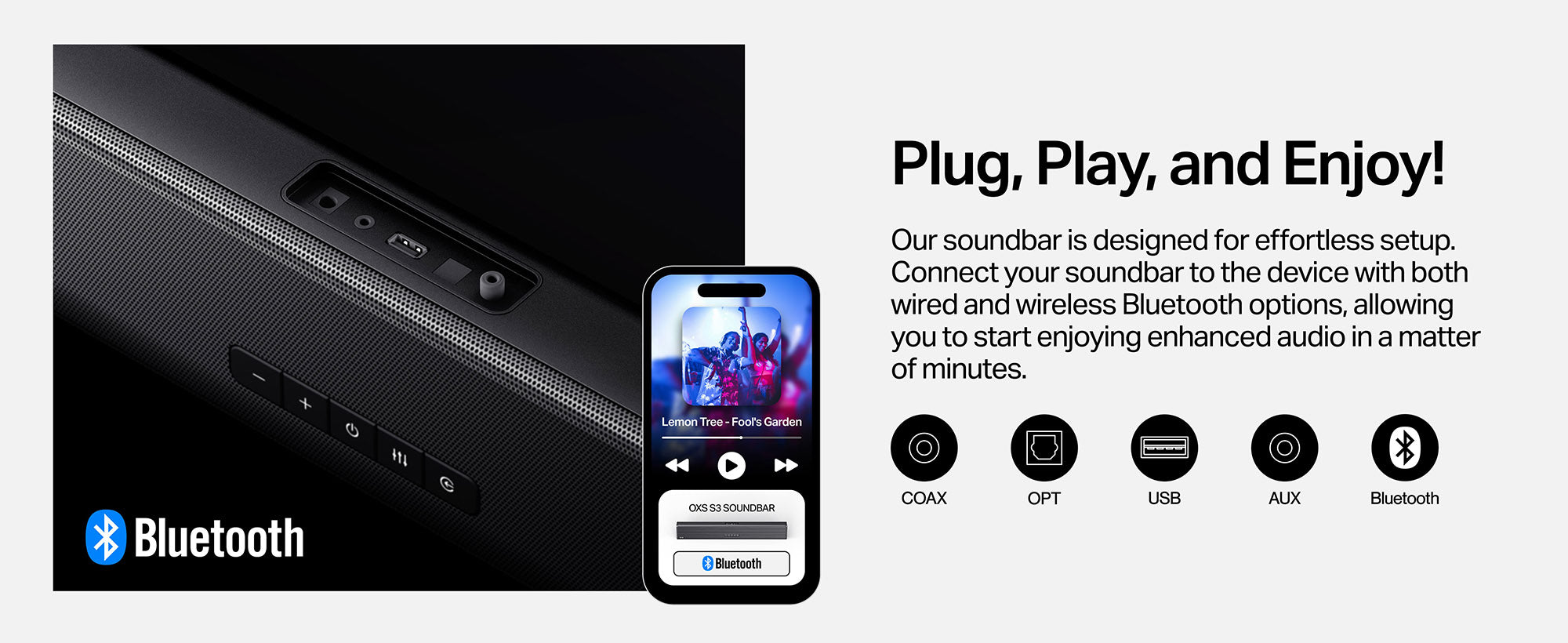 OXS S3 soundbar supports multiple wireless and wired connections to let you quickly connect to your devices. Besides, there is a light guide for connections and equalizer modes on soundbar to help you know the usage status timely. With stylish design, you can choose to place the soundbar directly on the table, stand, cabinet or mount it on a wall to save your space according to your home decoration style and personal preferences.